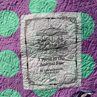 While most of the free motion quilting was "free-hand meanderings," I did transfer a circus tent design in the yellow and green border triangles using water-soluble stabilizer upon which the design was drawn with Sharpie marker, then pinned to the quilt surface.
